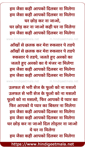 Lyrics of Hum Jaisa Apko Kahi Dilbar Na Milega - हम जैसा कही आपको दिलबर ना मिलेगा