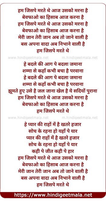Lyrics of Hum Jispe Marte The - हम जिसपे मरते थे