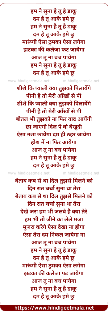 Lyrics of Hum Ne Suna Hai Tu Hai Daku - हम ने सुना है तू है डाकू