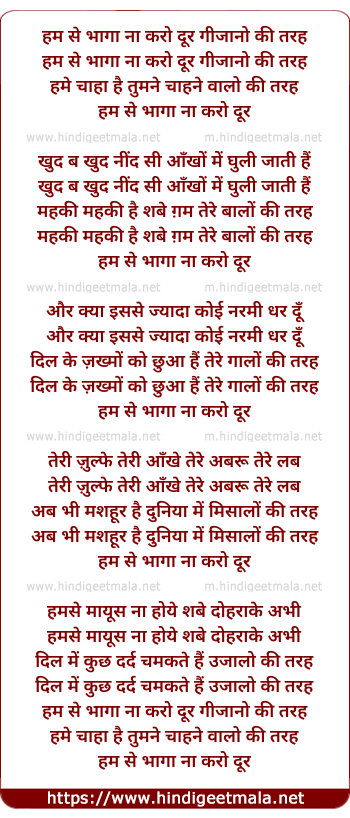 Lyrics of Hum Se Bhaaga Na Karo Dur - हम से भागा ना करो दूर गीजानो की तरह