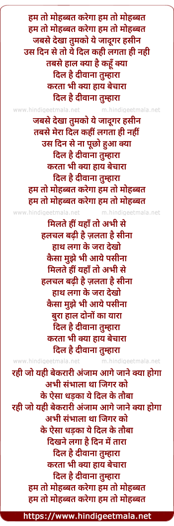 Film CastBobby Deol, Karisma Kapoor, Johny Lever, Shakti Kapoor, Sadashiv Amrapurkar, Vijay Kashyap, Dalip Tahil, Rohit Roy, Pramod Moutho, Razzak Khan, Raj ZutshiSingerAbhijeet, Alka Yagnik, Anu Malik, Kumar Sanu, Shraddha Pandit, Sonu Nigam, Sudesh Bhosle, Sukhwinder Singh, Sunidhi ChauhanLyricistMajrooh SultanpuriMusic ByAnu MalikDirectorKundan ShahProducerK P SinghExternal LinksHum To Mohabbat Karega at IMDB Hum To Mohabbat Karega at WikipediaYouTubeHum To Mohabbat Karega at YT