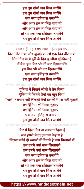 Lyrics of Hum Tum Dono Jab Mil Jayenge Ek Naya Itihas Banayenge - हम तुम दोनों जब मिल जायेंगे एक नया इतिहास बनायेंगे