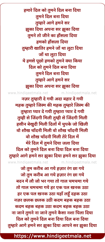 Lyrics of Humare Dil Ko Tumne Dil Bana Diya - हमारे दिल को तुमने दिल बना दिया