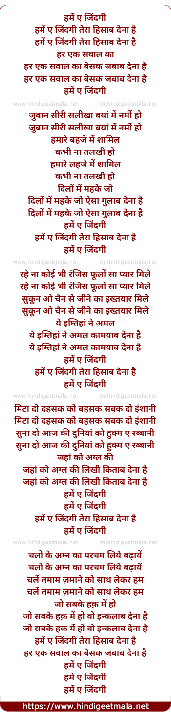 Lyrics of Hume Aye Zindagi Tera Hisaab Dena Hai - हमें ए जिंदगी