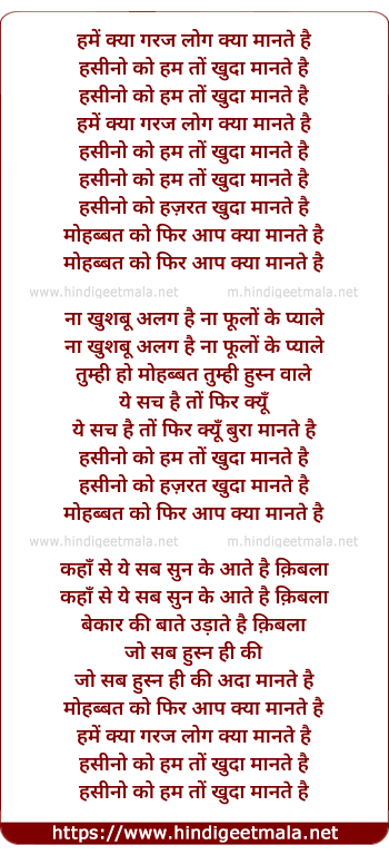 Lyrics of Hume Kya Garaz Log Kya Mante Hai - हमें क्या गरज लोग क्या मानते है