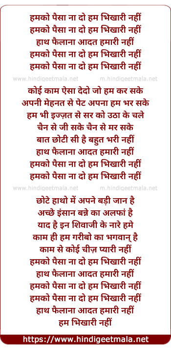 Lyrics of Humko Paisa Na Do, Hum Bikhari Nahi - हमको पैसा ना दो, हम भिखारी नहीं
