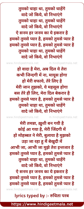 Lyrics of Humko Tumse Pyar Hain - हमको तुमसे प्यार है