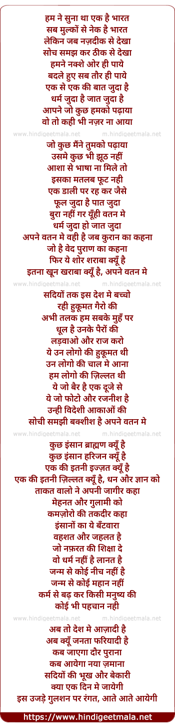 Lyrics of Humne Suna Tha Ek Hai Bharat - हम ने सुना था एक है भारत