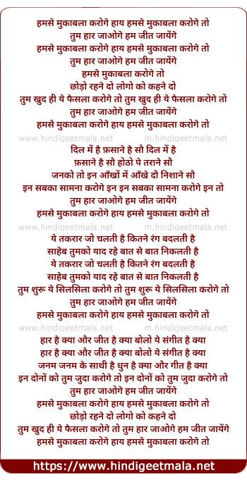 Lyrics of Humse Muqabla Karoge To, Tum Haar Jaaoge Hum Jeet Jaaynge - हमसे मुकाबला करोगे तो, तुम हार जाओगे हम जीत जायेंगे