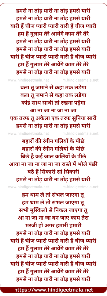 Lyrics of Humse Na Todh Yaari - हमसे ना तोड़ यारी
