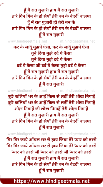 Lyrics of Hu Main Raat Guzaari Haye Taare Gin Gin Ke - हूँ मैं रात गुज़ारी हाय तारे गिन गिन के