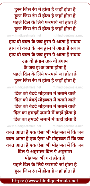 Lyrics of Husn Jis Rang Me Hota Hai - हुस्न जिस रंग में होता है जहाँ होता है