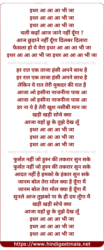Lyrics of Idhar Aa Aa Bhi Jaa Chali Kaha Aaj Jane Nahi Dunga - इधर आ आ आ भी जा चली कहाँ आज जाने नहीं दूंगा