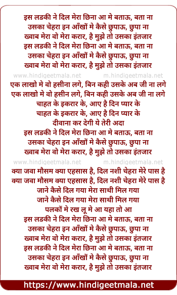 Lyrics of Is Ladki Ne Dil Mera Cheena - इस लडकी ने दिल मेरा छिना