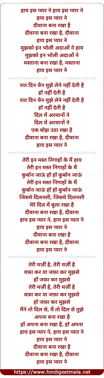 Lyrics of Is Pyar Ne Diwana Bana Rakha Hai - हाय इस प्यार ने हाय इस प्यार ने