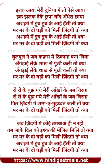 Lyrics of Ishq Aayaa, Ashaqo Me Dub Dub Ke Aayee Hansee To Kya - इश्क़ आया, अश्कों में डूब डूब के आई हँसी तो क्या