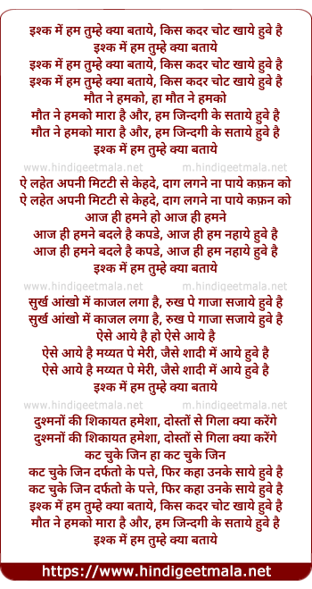 Lyrics of Ishq Me Hum Tumhe Kya Bataye Kis Kadar Chot Khaye Hue Hai - इश्क में हम तुम्हे क्या बताये, किस कदर चोट खाये हुये है