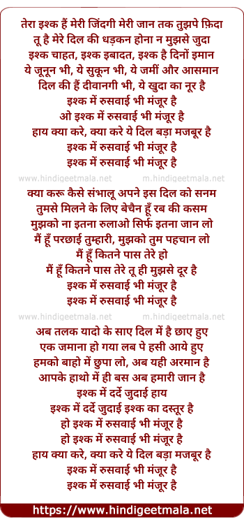 Lyrics of Ishq Me Ruswai Bhi Manjur Hai - इश्क में रुसवाई भी मंजूर हैं