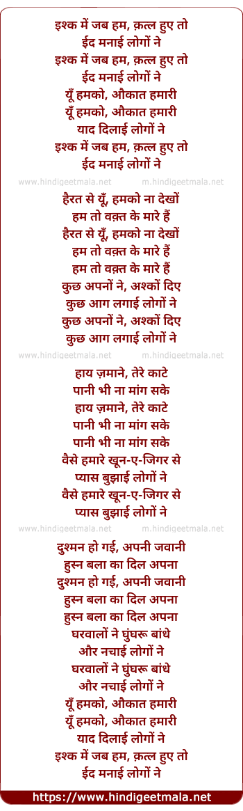 Lyrics of Ishq Mein Jab Hum - इश्क में जब हम, क़त्ल हुए तो