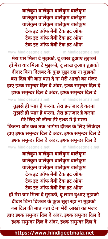 Lyrics of Ishq Samundar (Reloaded) - वालेकुम वालेकुम वालेकुम वालेकुम