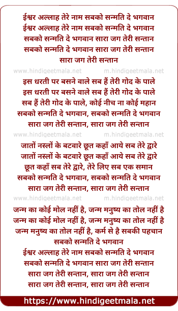 Lyrics of Ishwar Allaah Tere Naam Sabko Sanmatti De Bhagwan - ईश्वर अल्लाह तेरे नाम सबको सन्मति दे भगवान