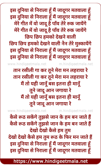 Lyrics of Iss Duniya Se Nirala Hu Mai - इस दुनिया से निराला हूँ मैं