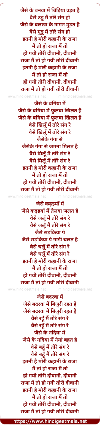 Lyrics of Itani Hai Mori Kahani Ke Raja Main To Ho Gayi Tori Diwani - इतनी है मोरी कहानी के राजा मैं तो हो गयी तोरी दीवानी