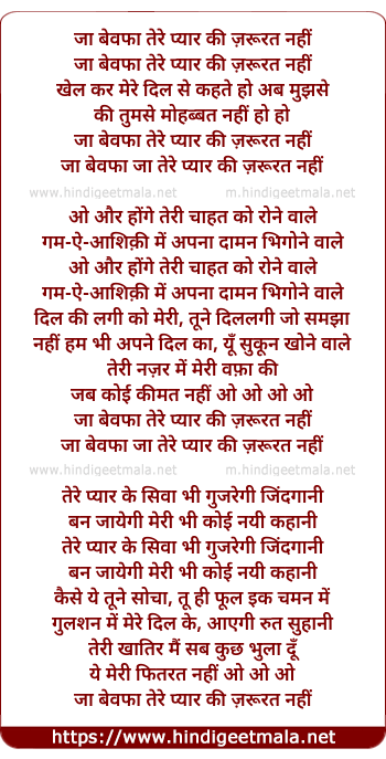 Lyrics of Ja Bewafa Tere Pyar Ki Zarurat Nahi - जा बेवफा तेरे प्यार की ज़रूरत नहीं