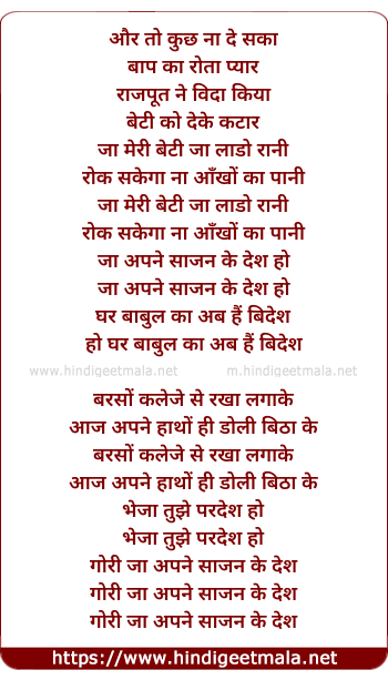 Lyrics of Ja Meri Beti Ja Lado Rani - जा मेरी बेटी जा लाडो रानी
