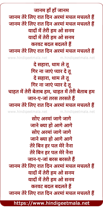 Lyrics of Janam Tere Liye Raat Din Araman Machal - जानम तेरे लिए रात दिन अरमां मचल