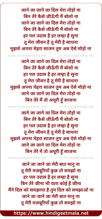 Lyrics of Jaane Jaan Dil Meraa Kyo - जाने जा जाने जा दिल मेरा तोड़ो ना