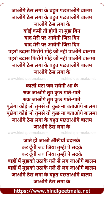 Lyrics of Jaaoge Thes Lagaa Ke Bahut Pachhataaoge - जाओगे ठेस लगा के बहुत पछताओगे