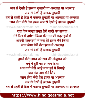 Lyrics of Jab Se Dekhi Hai Jhalak Tumhari - जब से देखी है झलक तुम्हारी या अल्लाह या अल्लाह