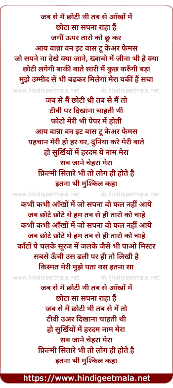Lyrics of Jab Se Mai Choti Thi - जब से मैं छोटी थी