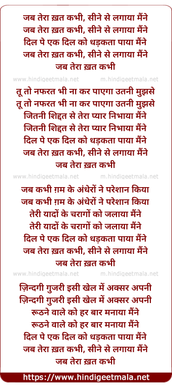 Lyrics of Jab Tera Khat Kabhi - जब तेरा ख़त कभी, सीने से लगाया मैंने