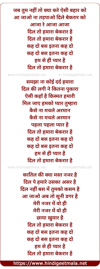 Lyrics of Jab Tum Nahi To Kya Kare - जब तुम नहीं तो क्या करे
