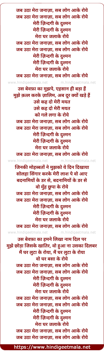 Lyrics of Jab Uthaa Mera Janaza - जब उठा मेरा जनाज़ा, सब लोग आके रोये