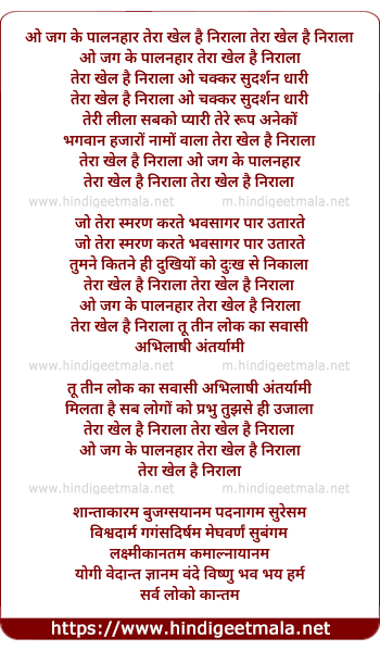 Lyrics of Jag Ke Palanhar Tera Khel Hai Nirala - जग के पालनहार तेरा खेल है निराला