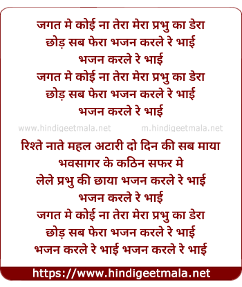 Lyrics of Jagat Me Na Tera Na Koi Mera, Prabhu Ka Dera - जगत मे ना तेरा ना कोई मेरा, प्रभु का डेरा