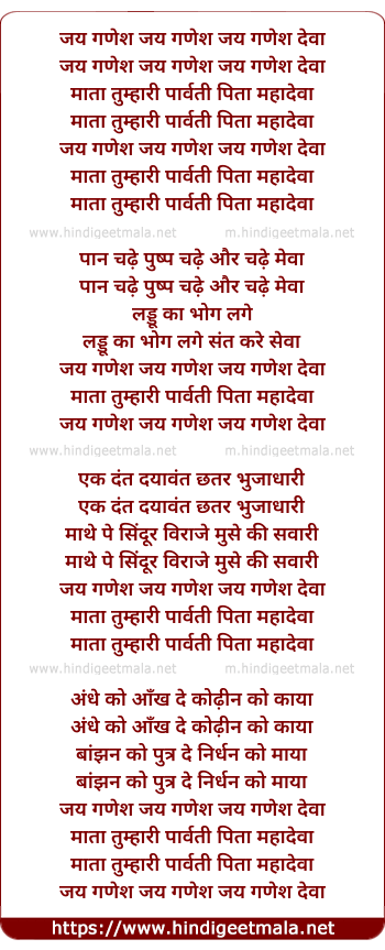 Lyrics of Jai Ganesh Jai Ganesh Jai Ganesh Deva - जय गणेश जय गणेश जय गणेश देवा