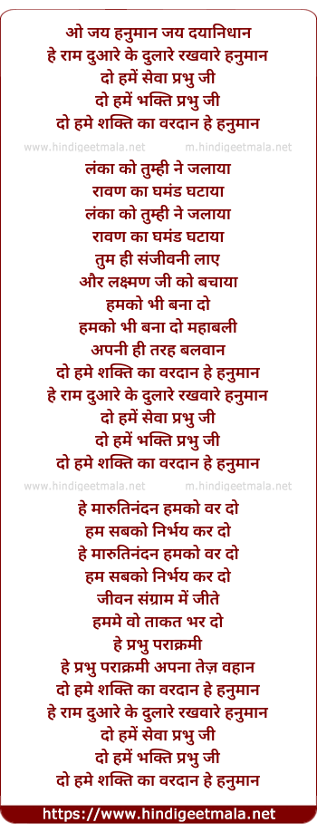 Lyrics of Jai Hanuman (Anmol Sitare) - ओ जय हनुमान जय दयानिधान