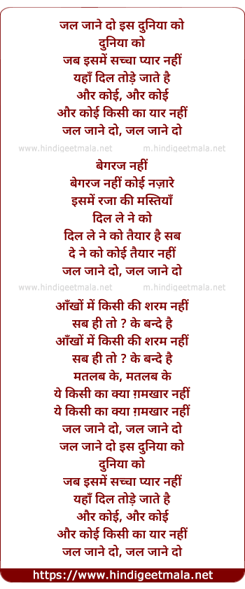 Lyrics of Jal Jane Do Is Duniya Ko - जल जाने दो इस दुनिया को