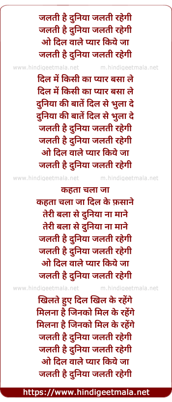 Lyrics of Jalati Hai Duniya Jalati Rahegi - जलती है दुनिया जलती रहेगी