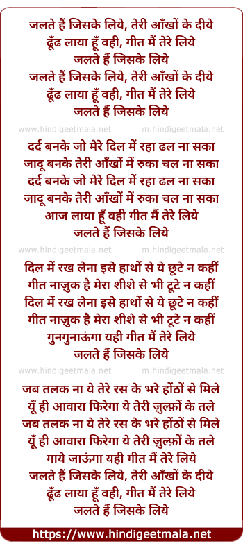 Lyrics of Jalte Hai Jiske Liye, Teri Aankho Ke Diye - जलते हैं जिसके लिये, तेरी आँखों के दीये