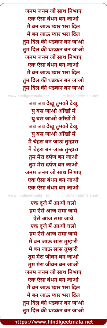 Lyrics of Janam Janam Jo Saath Nibhaye Ek Aisa Bhandhan Ban Jao - जन्म जन्म जो साथ निभाये एक ऐसा बंधन बन जाओ