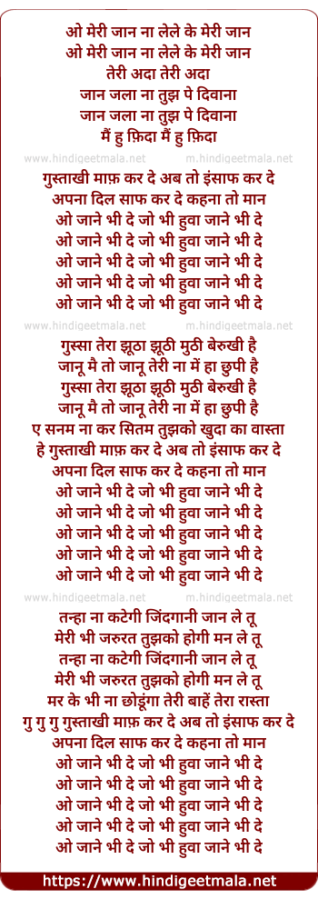 Lyrics of Jane Bhee De Jo Bhee Huwa - ओ मेरी जान ना लेले के मेरी जान