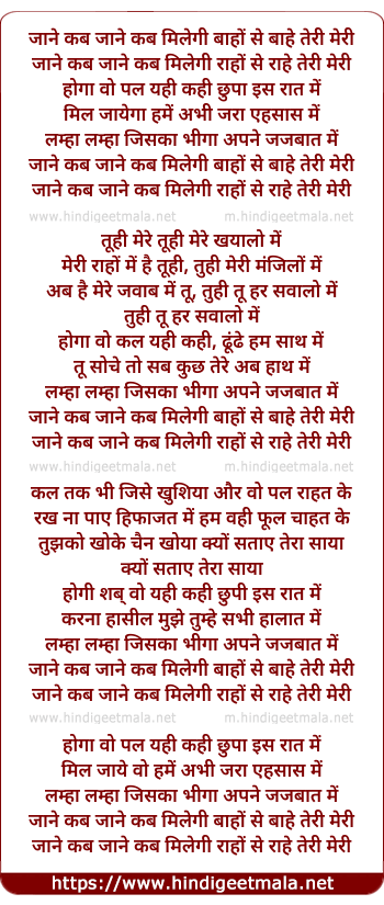 Lyrics of Jane Kab Milengi Baaho Se Baahe Teri - जाने कब मिलेगी बाहों से बाहे तेरी