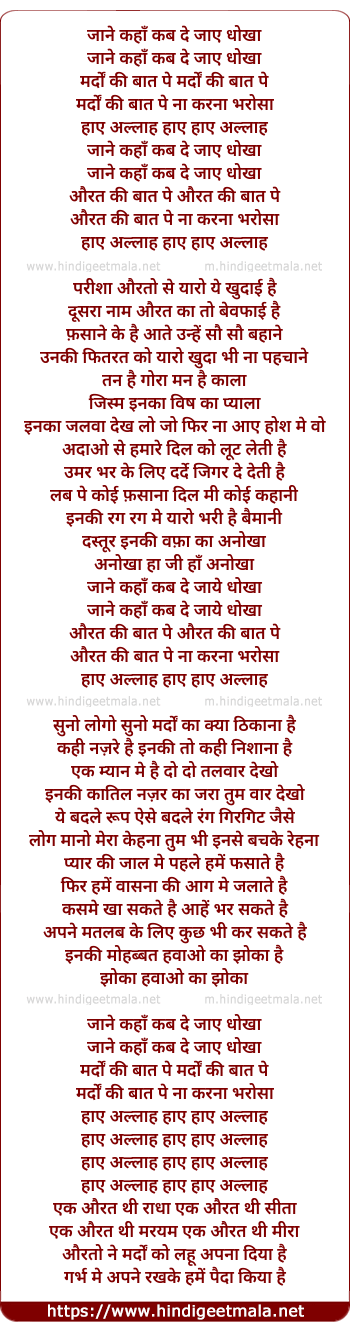Lyrics of Jane Kaha Kab De Jaye Dhokha - जाने कहाँ कब दे जाए धोखा