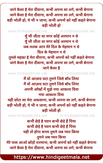 Lyrics of Jane Kaisa Hai Mera Diwana, Kabhi Apna Sa Lage, Kabhi Begana - जाने कैसा है मेरा दीवाना, कभी अपना सा लगे, कभी बेगाना