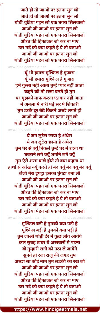 Lyrics of Jao Ji Jao Par Itna Sun Lo Thodi Chudiya Pahen Lo - जाओ जी जाओ पर इतना सुन लो थोड़ी चूड़िया पहन लो